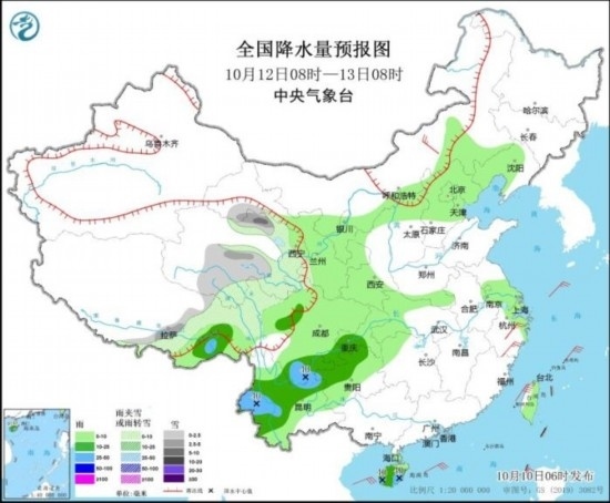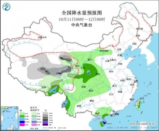 10月11日08時(shí)至12日08時(shí),甘肅西部、新疆南部、西藏北部和東部、青海大部、四川西北部等地部分地區(qū)有小到中雪或雨夾雪,其中,青海北部和南部局地有大雪或暴雪。西藏東南部、甘肅東部、陜西西南部、四川北部、云南西北部、雷州半島、海南島大部、臺灣東部等地部分地區(qū)有中到大雨,其中海南島東北部等地局地有暴雨(50~90毫米)。內(nèi)蒙古中部、河北西北部、山東半島、浙江、廣西南部等地部分地區(qū)有4~5級風(fēng)。東海南部、臺灣海峽、南海北部海域?qū)⒂?~7級、陣風(fēng)8~9級風(fēng)。