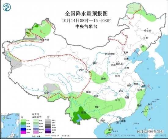 10月14日08時至15日08時,內(nèi)蒙古東北部、新疆西部、西藏南部等地部分地區(qū)有小到中雪或雨夾雪;黑龍江西北部、遼寧東部、陜西南部、甘肅東南部、四川南部、貴州大部、云南、廣西西部、湖南中南部、江西西南部、浙江中東部、福建東部、海南島及臺灣島等地部分地區(qū)有小到中雨,其中,云南南部局地有大雨。內(nèi)蒙古東北部、新疆西北部、河北北部等地部分地區(qū)有5~6級風(fēng);渤海、渤海海峽等海域有6~7級風(fēng)、陣風(fēng)8~9級。(見圖3)。