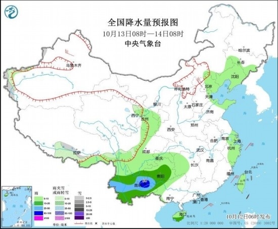 10月13日08時至14日08時,新疆西部、西藏南部等地部分地區(qū)有小雪或雨夾雪;四川南部、貴州中南部、云南大部等地部分地區(qū)有中到大雨,其中,云南東部局地有暴雨(50~80毫米)。新疆西北部、河北北部等地部分地區(qū)有5~6級風(fēng);臺灣海峽、巴士海峽、南海北部海域、北部灣等海域有5~7級風(fēng)、陣風(fēng)8級。(見圖2)。