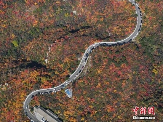 10月15日,航拍山西省太原市天龍山網(wǎng)紅橋秋景絢麗。近日,天龍山迎來(lái)秋景最佳觀賞期。中新社記者 武俊杰 攝