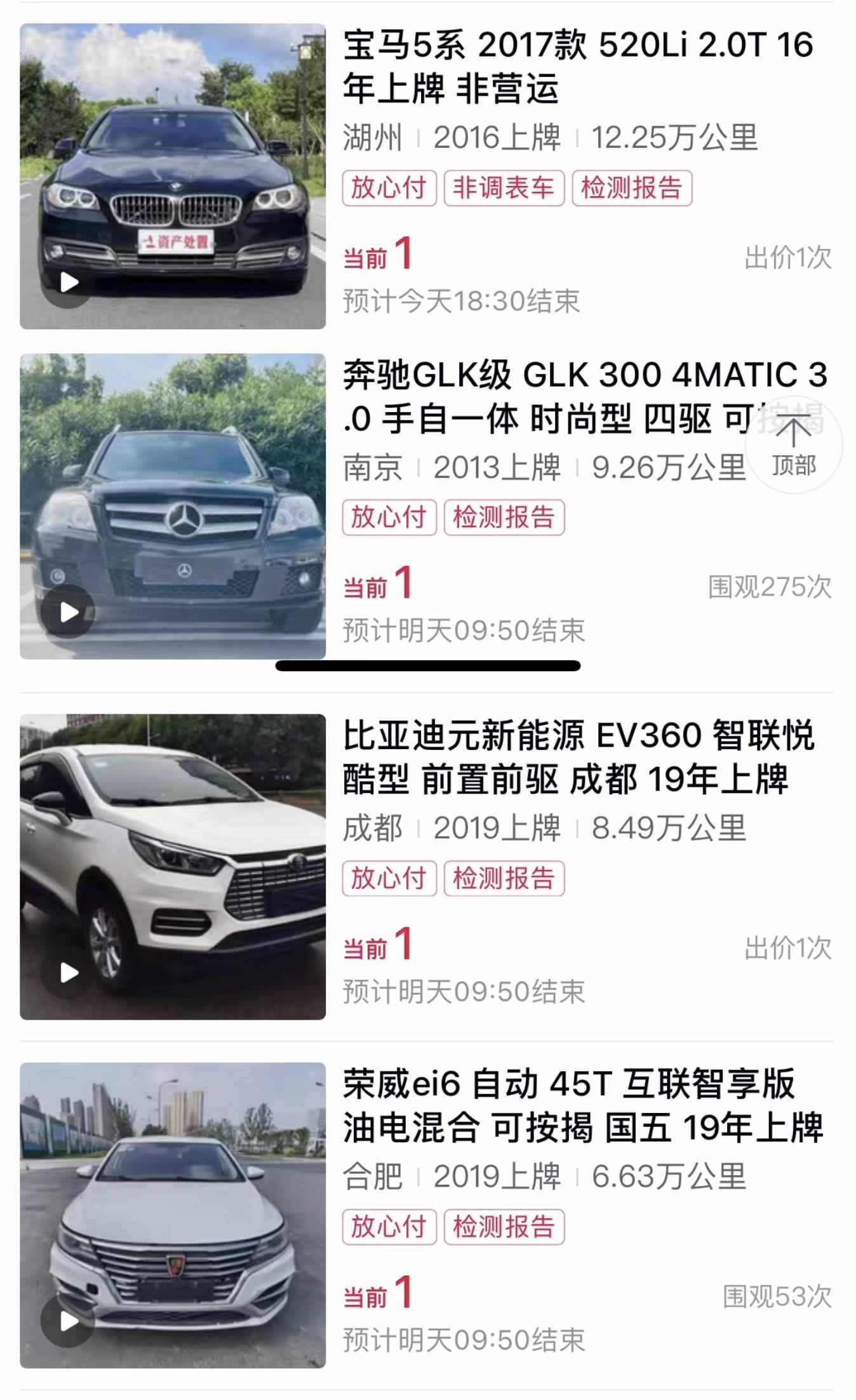 “1元賣奔馳”現(xiàn)象在該拍賣公司并只此一例。紅星新聞記者在上述武漢鑫車公司的平臺拍賣界面上看到,低價(jià)拍賣的車輛并不少見。如該公司掛出的一輛2011年上牌的寶馬2系,起拍價(jià)僅8元;一輛2015年上牌的奔馳GLA起拍價(jià)僅需9元。