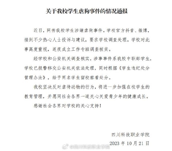 ·四川一高職院校學(xué)生宰殺流浪狗?校方:涉事兩名學(xué)生被留校察看,警方介入。