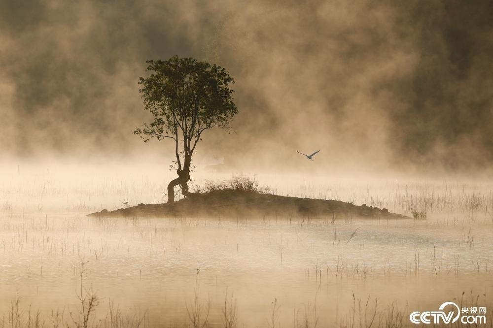 安徽省黃山市黟縣奇墅湖晨霧蒸騰,金色的霞光灑滿整個(gè)湖面,熠熠生輝,宛如仙境。