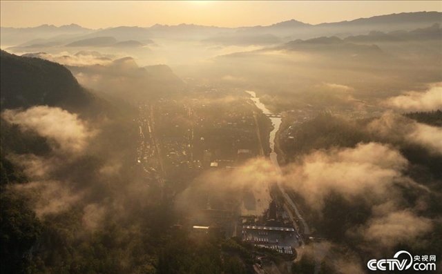 湖南張家界,武陵源景區(qū)內,朝霞、霧氣交錯疊彩,云紗霧幔的小城和群山環(huán)繞的美景交融。