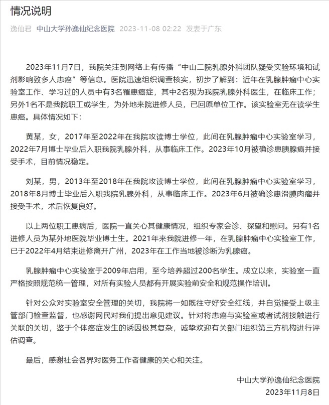 ·中山二院通報乳腺外科團隊多人患癌:近年有3人患癌,無在讀學生。