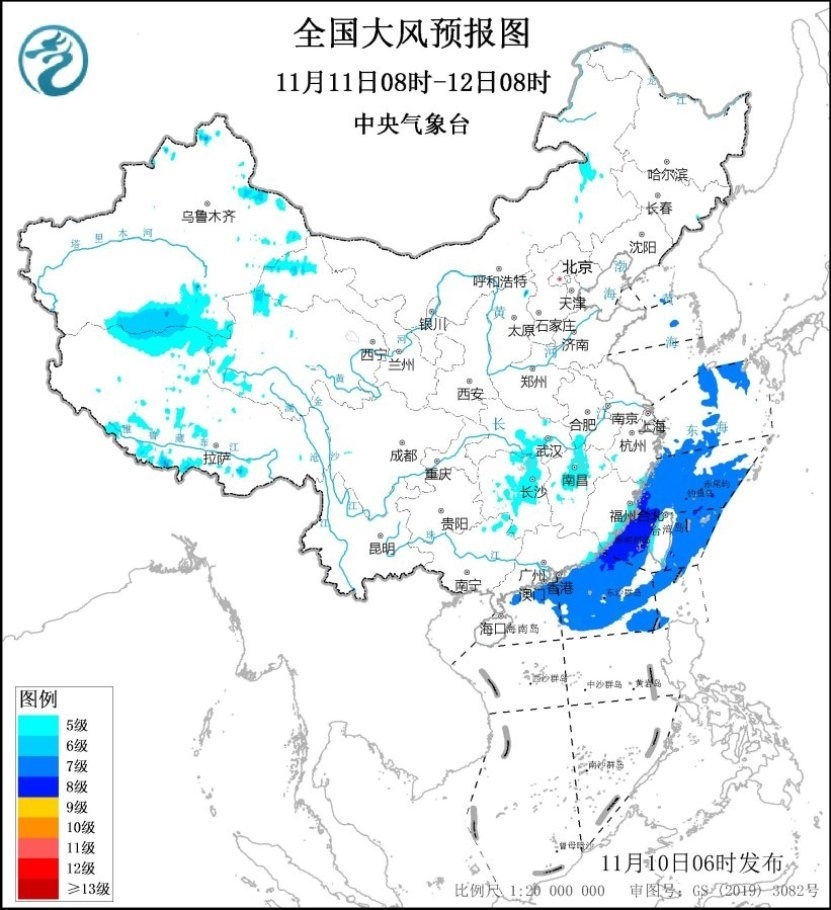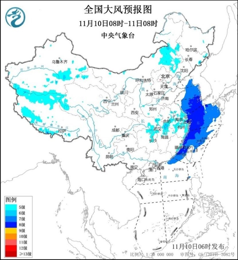 11月10日08時(shí)至11日08時(shí),內(nèi)蒙古中東部、遼寧西部、安徽中南部、河南南部、江蘇南部、上海、湖北南部、湖南東北部、江西北部、浙江北部及東部沿海、福建沿海、臺(tái)灣島沿海等地有5~6級(jí)、陣風(fēng)7~8級(jí)的大風(fēng);黃海大部海域、東海大部海域、臺(tái)灣海峽、臺(tái)灣以東洋面偏北海域、南海東北部偏北海域?qū)⒂?~8級(jí)、陣風(fēng)9~10級(jí)的大風(fēng)。11月11日08時(shí)至12日08時(shí),安徽南部、湖北中東部、湖南大部、江西中北部、廣西東北部以及福建沿海、廣東東部沿海、臺(tái)灣島沿海等地有5~6級(jí)、陣風(fēng)7~8級(jí)的大風(fēng);東海大部海域、臺(tái)灣海峽、臺(tái)灣以東洋面、南海北部海域、巴士海峽偏北海域?qū)⒂?~8級(jí)、陣風(fēng)9~10級(jí)的大風(fēng)。中央氣象臺(tái)11月10日06時(shí)繼續(xù)發(fā)布大風(fēng)藍(lán)色預(yù)警(見圖2、3)。
