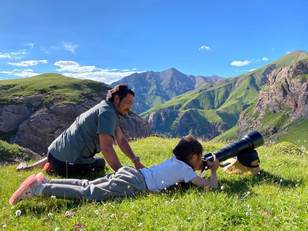 2020年7月,達杰在指導(dǎo)女兒拍攝雪豹。(受訪對象供圖)