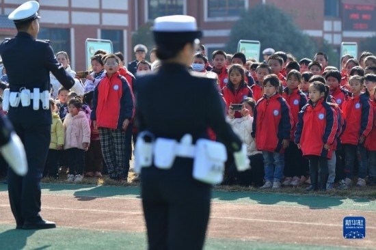 12月1日,在長(zhǎng)沙市望城區(qū)新河學(xué)校,學(xué)生觀看交警手勢(shì)演示。