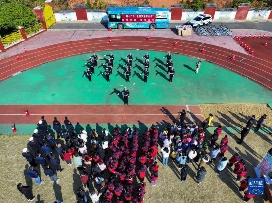 12月1日,在長(zhǎng)沙市望城區(qū)新河學(xué)校,學(xué)生觀看交警手勢(shì)演示(無(wú)人機(jī)照片)。