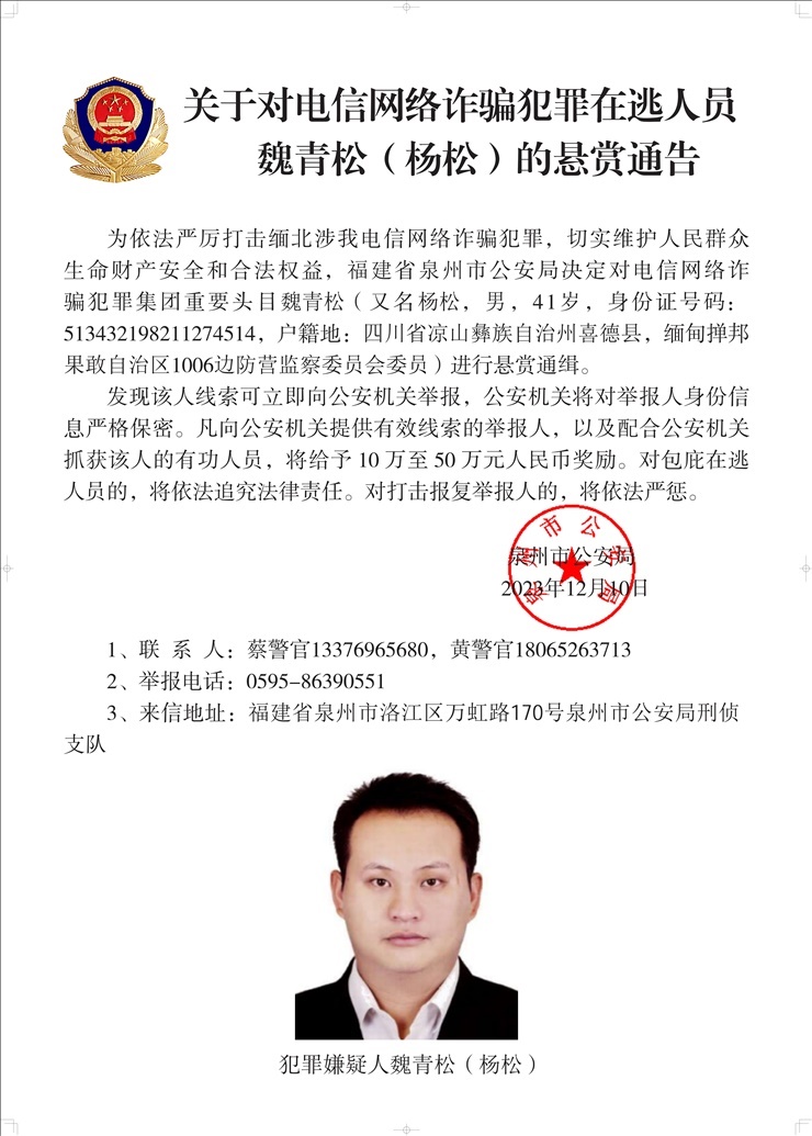 為依法嚴(yán)厲打擊緬北涉我電信網(wǎng)絡(luò)詐騙犯罪,切實(shí)維護(hù)人民群眾生命財(cái)產(chǎn)安全和合法權(quán)益,遼寧省大連市公安局決定對(duì)白所成、白應(yīng)蒼(又名李云晨)、白應(yīng)蘭(又名李夢(mèng)娜)進(jìn)行公開懸賞通緝;福建省泉州市公安局決定對(duì)魏懷仁、魏榕(又名陳榕)、魏青松(又名楊松)進(jìn)行公開懸賞通緝;福建省龍巖市公安局決定對(duì)劉正祥、劉積光(又名李華光)、劉正茂進(jìn)行公開懸賞通緝;重慶市公安局決定對(duì)徐老發(fā)(又名徐發(fā)啟)進(jìn)行公開懸賞通緝。