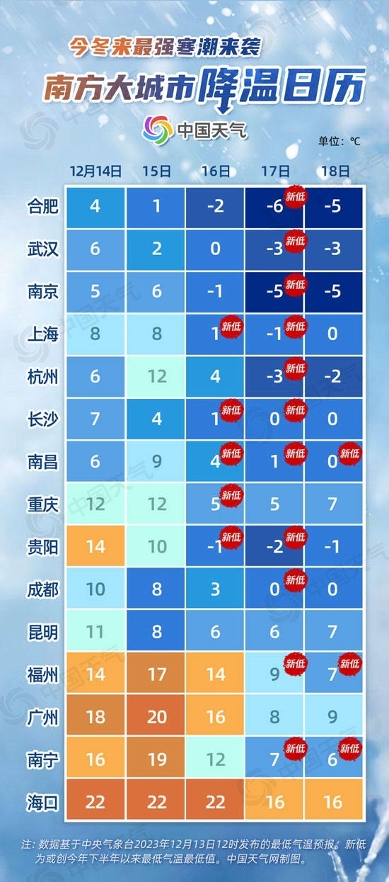 從中國天氣網(wǎng)推出的南方大城市降溫日歷來看,未來五天,合肥、武漢、南京、上海、杭州、貴陽最低氣溫都將逐步下降到冰點以下。南昌16日至18日最低氣溫或連創(chuàng)新低,貴陽最低氣溫將從14℃降至-2℃,降幅可達(dá)16℃。