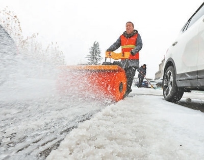 在河南省武陟縣一處停車場,環(huán)衛(wèi)工人在清除積雪。馮小敏攝(新華社發(fā))