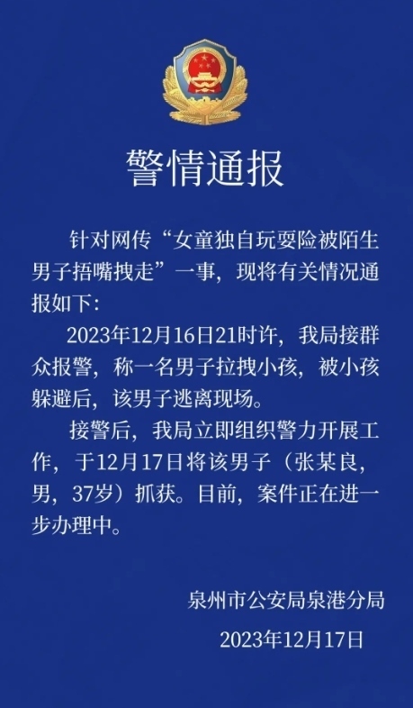 ·警方通報福建泉州一女童險被陌生男子捂嘴拽走:已將該男子抓獲。