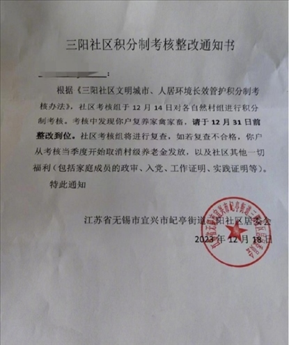 ·江蘇宜興一社區(qū)禁止養(yǎng)家禽,不整改將取消村級養(yǎng)老金、工作證明、入黨等福利,官方回應(yīng):撤銷通知書、廢止考核,調(diào)查處理責(zé)任人。