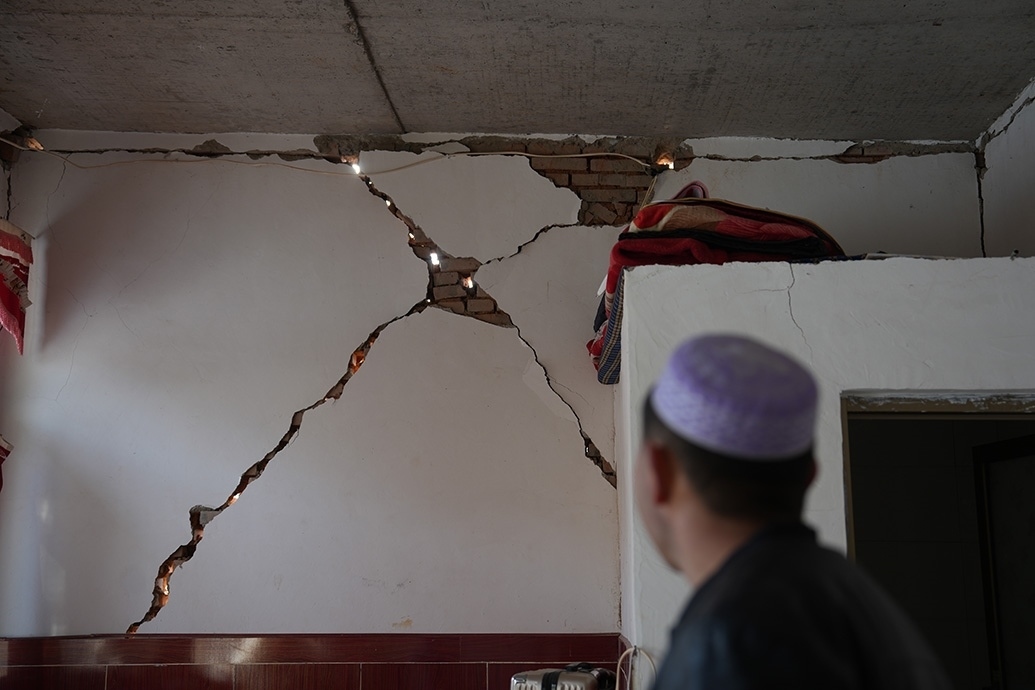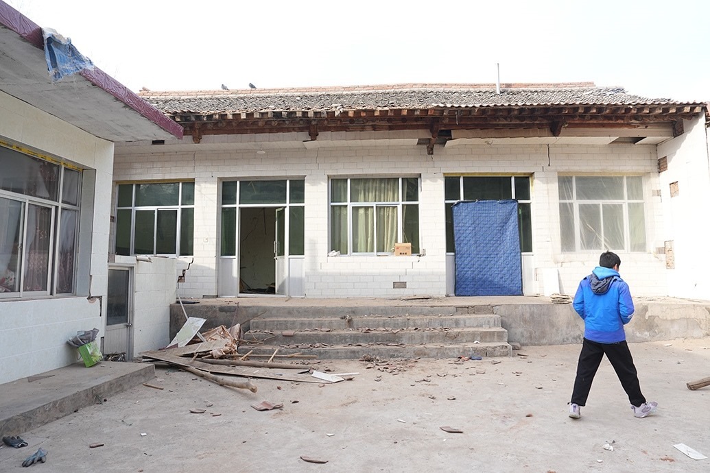 震后,他家木頭架構(gòu)的屋頂傾斜了些,磚瓦墻多處開(kāi)裂,土炕也裂了,柴火的煙從裂縫滲出,有些嗆人。原則上,他家是不能再進(jìn)入了,但上課的話,房間更舒適暖和點(diǎn)。