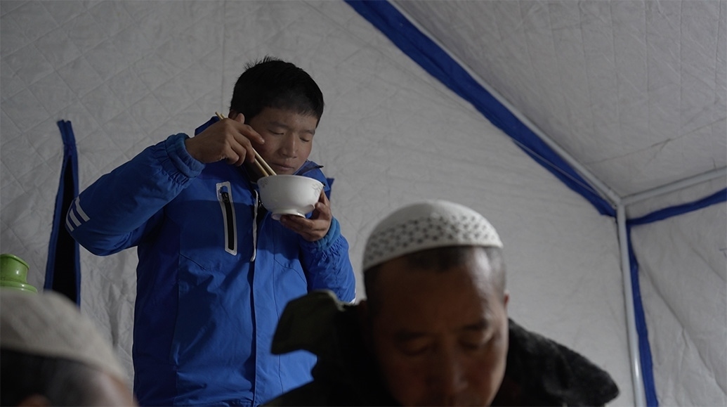 12月20日,馬國(guó)忠一家回到村里,拿塑料布在家附近搭了個(gè)簡(jiǎn)易帳篷,兩根木頭、一條橫梁支起來(lái),怕煙筒把塑料烤化,帳篷里不能烤火,頂多防風(fēng),但馬國(guó)忠覺(jué)得比車?yán)飶?qiáng)多了。家里的電熱毯拿出來(lái)鋪上,他才睡了個(gè)安穩(wěn)覺(jué)。只是半夜來(lái)了余震,又醒了。他止不住想:下一步怎么辦?后面會(huì)不會(huì)繼續(xù)搖?他家鋼管焊的牛棚頂晃得“乒乒乓乓”響。