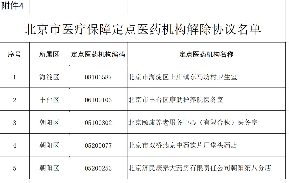 北京市海淀區(qū)上莊鎮(zhèn)東馬坊村衛(wèi)生室等5家定點(diǎn)醫(yī)藥機(jī)構(gòu)因已注銷,申請(qǐng)解除協(xié)議。經(jīng)市、區(qū)醫(yī)保經(jīng)辦機(jī)構(gòu)審核,對(duì)上述5家定點(diǎn)醫(yī)藥機(jī)構(gòu)解除協(xié)議(見附件4)。