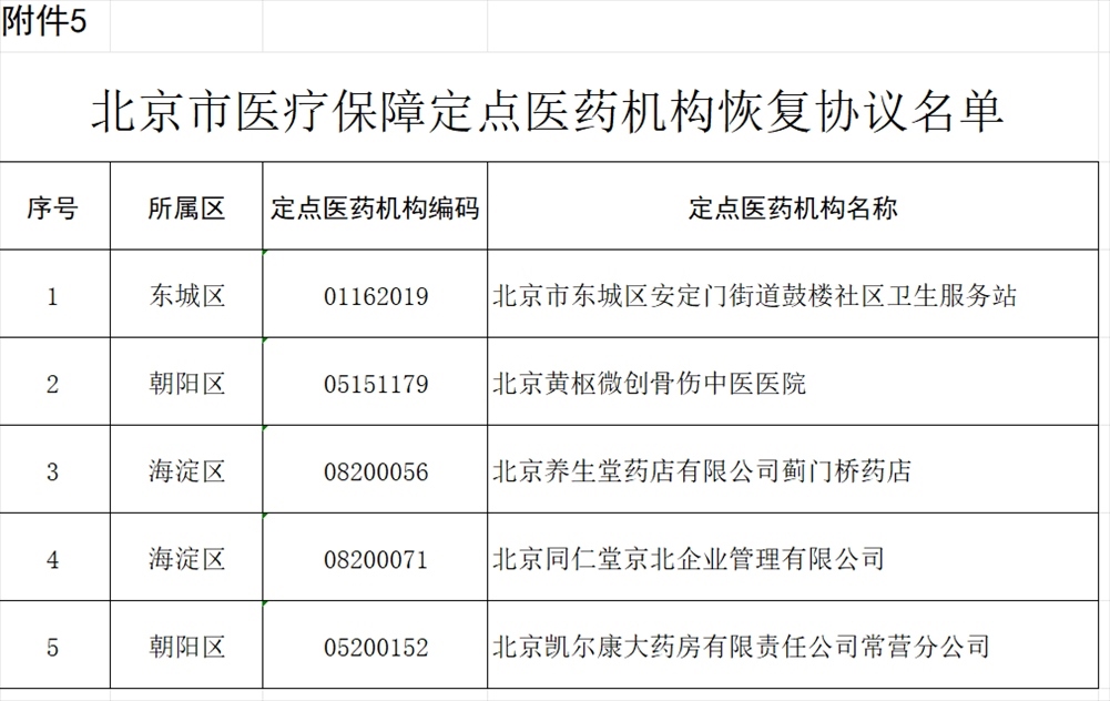 北京市東城區(qū)安定門街道鼓樓社區(qū)衛(wèi)生服務(wù)站等5家醫(yī)藥機(jī)構(gòu)申請(qǐng)恢復(fù)協(xié)議,經(jīng)市、區(qū)醫(yī)保經(jīng)辦機(jī)構(gòu)審核,上述5家醫(yī)藥機(jī)構(gòu)已經(jīng)具備承擔(dān)醫(yī)療保障任務(wù)的條件,現(xiàn)決定對(duì)上述5家醫(yī)藥機(jī)構(gòu)恢復(fù)協(xié)議(見附件5)。