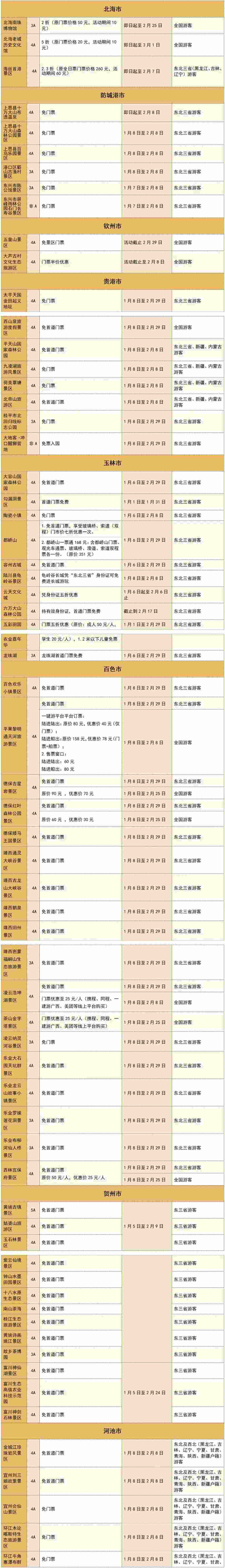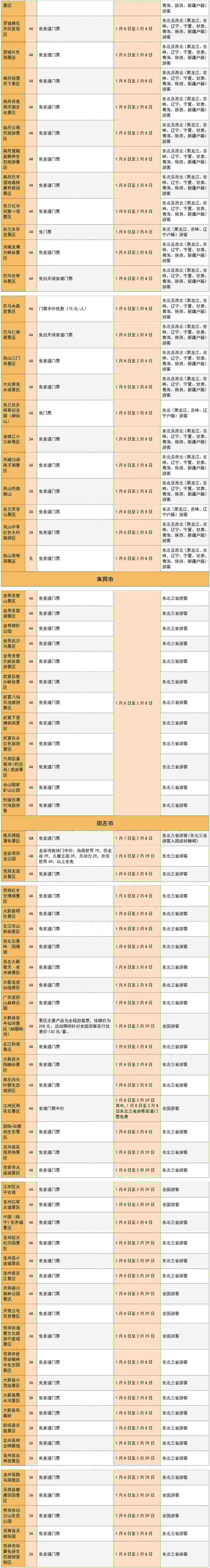 柳州程陽(yáng)八寨景區(qū)、桂林桂海晴嵐、百色靖西通靈大峽谷景區(qū)、百色樂(lè)業(yè)大石圍天坑群景區(qū)、賀州黃姚古鎮(zhèn)景區(qū)、河池羅城棉花天坑度假區(qū)、崇左德天跨國(guó)瀑布景區(qū)、崇左大新縣明仕景區(qū)、崇左左江花山巖畫(huà)景區(qū)等等,近兩百家廣西景區(qū)面向東北“老鐵”推出免門票或打折優(yōu)惠政策!此外,還有多家景區(qū)面向全國(guó)游客推出優(yōu)惠政策!