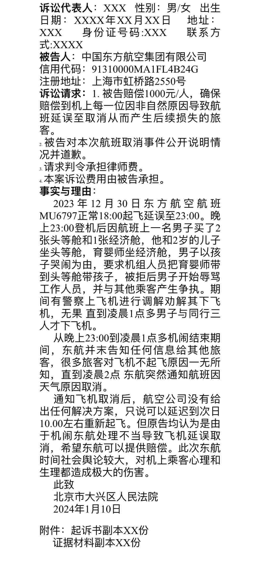 群內(nèi)發(fā)出的起訴書(shū)寫(xiě)道:“從當(dāng)日23點(diǎn)到次日凌晨1點(diǎn)多機(jī)鬧結(jié)束期間,東航并未告知任何信息給其他旅客,很多旅客對(duì)飛機(jī)不起飛原因一無(wú)所知,直到凌晨2點(diǎn),東航突然通知航班因天氣原因取消。通知飛機(jī)取消后,航空公司沒(méi)有給出任何解決方案,只說(shuō)可以延遲到次日10點(diǎn)左右重新起飛。但原告均認(rèn)為是由于機(jī)鬧,東航處理不當(dāng),導(dǎo)致飛機(jī)延誤取消,希望東航可以提供賠償。此次東航事件社會(huì)輿論較大,對(duì)機(jī)上乘客心理和生理都造成極大的傷害。”據(jù)悉,乘客們擬起訴至北京市大興區(qū)人民法院。