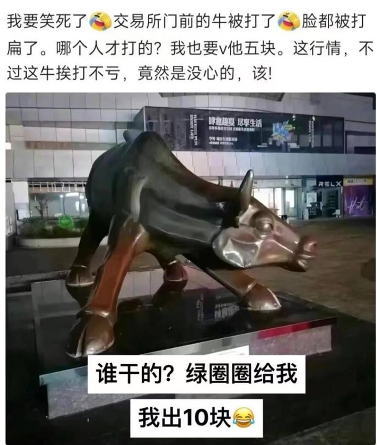 帖文中寫道:交易所的牛被砸了?請(qǐng)別這么極端,冤有頭債有主,牛何其無(wú)辜。牛被打臉、??招氖切苁泻笃谔卣?。