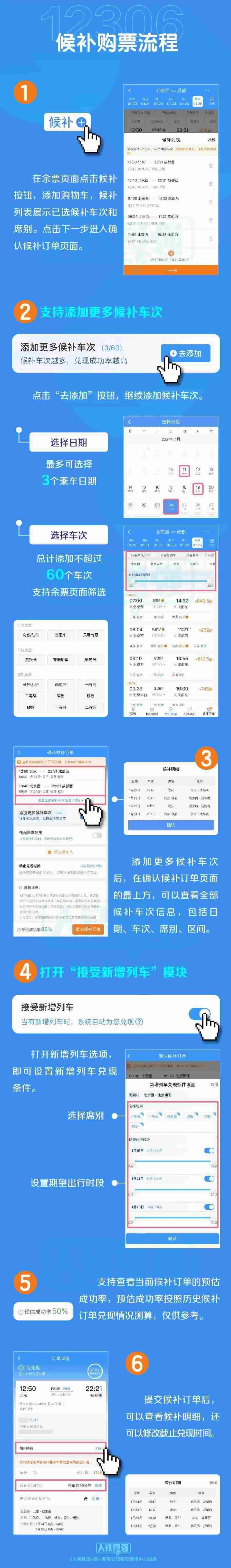 為提升旅客購(gòu)票體驗(yàn),鐵路部門(mén)加大研發(fā)力度,對(duì)鐵路12306候補(bǔ)購(gòu)票功能進(jìn)行了優(yōu)化升級(jí)。一是增加候補(bǔ)訂單數(shù)量。每名旅客可提交的待兌現(xiàn)候補(bǔ)訂單數(shù)量由2個(gè)增至6個(gè),每個(gè)訂單最多可添加9名乘車(chē)人。二是增加備選方案數(shù)量。原來(lái)旅客提交候補(bǔ)訂單時(shí),可選擇相鄰2個(gè)乘車(chē)日期、每個(gè)日期可選擇5個(gè)“車(chē)次+席別”的組合,最多可選擇10個(gè)組合。優(yōu)化升級(jí)后,旅客可選擇預(yù)售期內(nèi)任意3個(gè)乘車(chē)日期,累計(jì)最多可選擇60個(gè)“日期+車(chē)次”的組合,每個(gè)車(chē)次可選多個(gè)席別。三是擴(kuò)大候補(bǔ)訂單兌現(xiàn)時(shí)間選擇范圍。原來(lái)候補(bǔ)訂單截止兌現(xiàn)時(shí)間最晚為開(kāi)車(chē)前2小時(shí),優(yōu)化升級(jí)后調(diào)整為開(kāi)車(chē)前20分鐘,旅客可在更大范圍內(nèi)根據(jù)實(shí)際情況自主選擇修改截止兌現(xiàn)時(shí)間。四是臨時(shí)新增旅客列車(chē)席位優(yōu)先配售給已提交候補(bǔ)訂單的旅客。旅客在提交候補(bǔ)訂單時(shí),可選擇接受購(gòu)買(mǎi)符合出行需求的新增旅客列車(chē)車(chē)票,如鐵路部門(mén)臨時(shí)新增旅客列車(chē),在車(chē)票起售時(shí),鐵路12306將自動(dòng)優(yōu)先配售給已提交候補(bǔ)訂單的旅客,旅客無(wú)需人工查詢?cè)鲩_(kāi)列車(chē)信息再購(gòu)票。