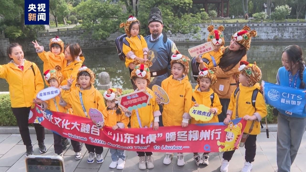 小朋友們統(tǒng)一穿著黃色外套,頭戴可愛的老虎帽,就連推著的行李箱也是“虎紋”的,萌感十足。和“小砂糖橘”一樣,“小東北虎”們最大的不過6歲,最小的才3歲,一下飛機,“小東北虎”就收到了暖心禮物。10日,“小東北虎”來到柳侯祠,訪一代宗師柳宗元,感受柳州的千年歷史文化,在馬鞍山公園俯瞰了整座柳州城,在螺螄粉文化展館打卡柳州螺螄粉,夜游百里柳江,玩得不亦樂乎。