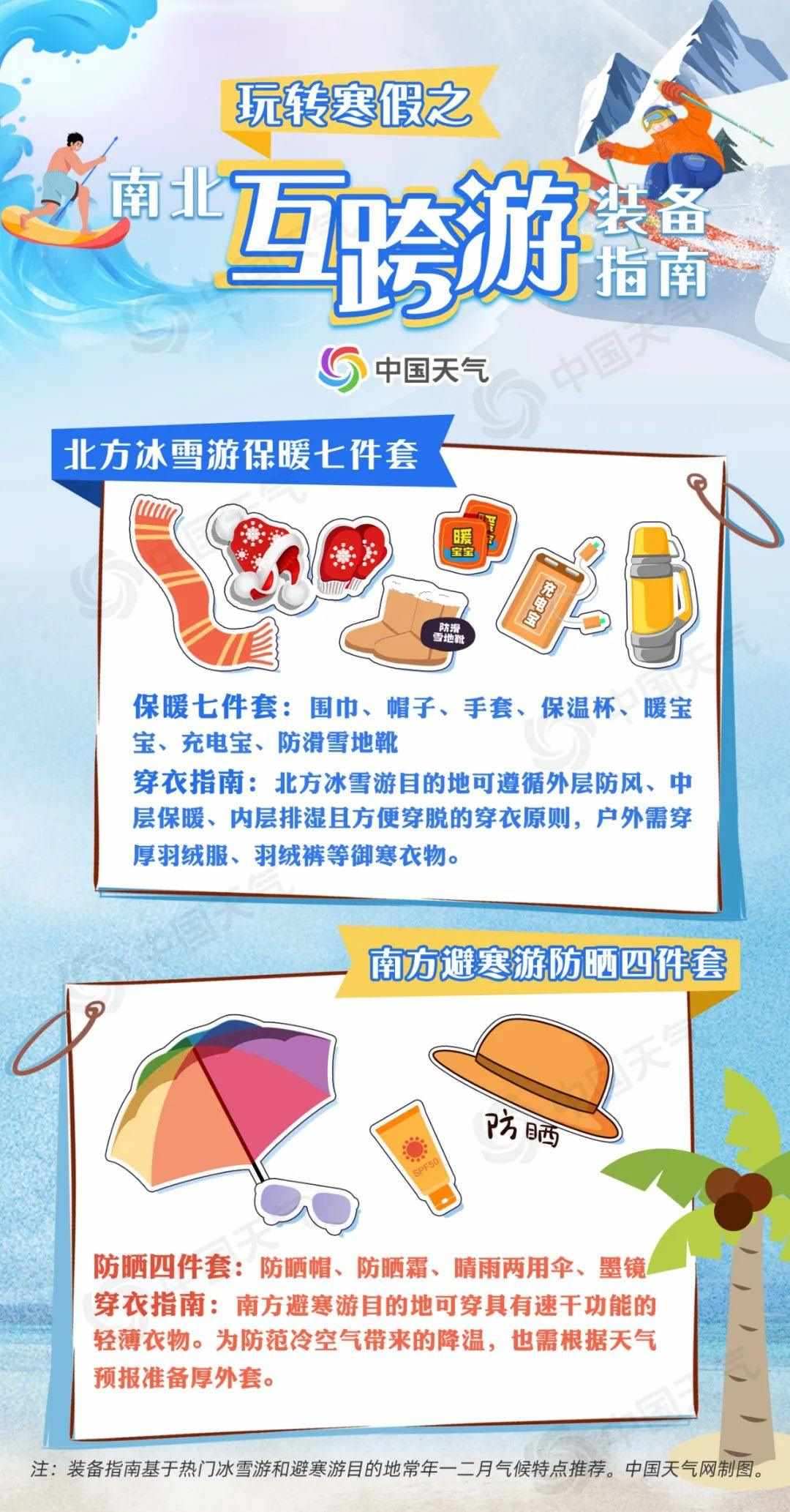無論是北上戲冰雪,還是南下避寒游,裝備是否齊全直接關系到旅游行程的質量。對于前往北方冰雪游的朋友來說,防寒保暖至關重要;南下避寒則要注意防曬防蚊。