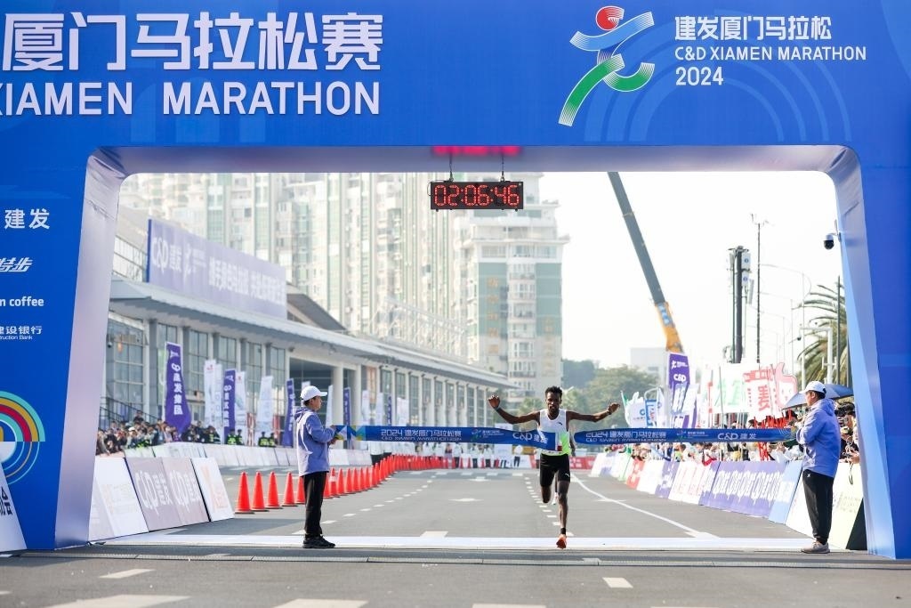 1月7日,埃塞俄比亞選手凱碧貝在廈馬比賽中沖過終點線。新華社發(fā)(廈門馬拉松賽事組委會供圖)