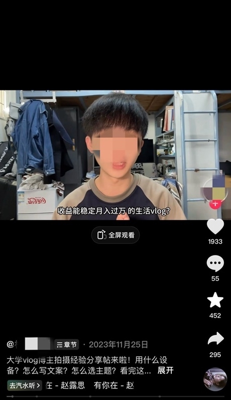 2023年11月25日,一名自稱大學(xué)生的短視頻博主向大學(xué)生網(wǎng)友分享自己如何零基礎(chǔ)拍攝Vlog穩(wěn)定收益月入過萬元。
