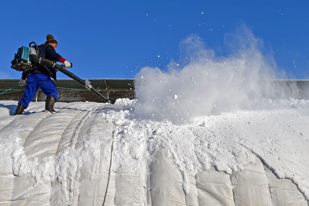 2023年12月17日,農(nóng)民在山東省煙臺市福山區(qū)門樓街道用鼓風機清理暖棚上的積雪。新華社發(fā)(孫文潭攝)