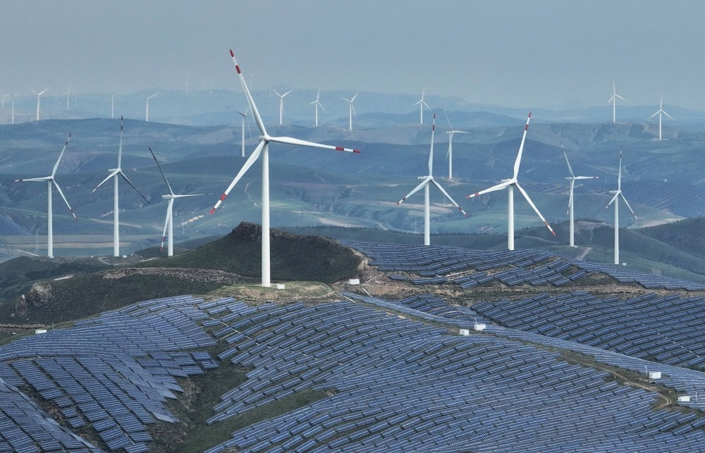 這是2023年9月2日拍攝的承德市豐寧滿族自治縣萬勝永鄉(xiāng)萬勝永村附近的一處風光互補發(fā)電場(無人機照片)。新華社記者楊世堯 攝