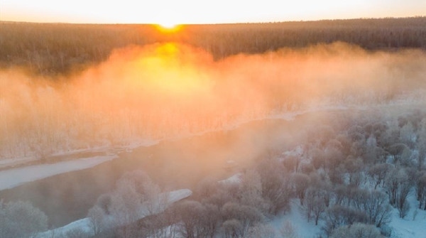 日出時(shí)分,在黑龍江省遜克縣克林鎮(zhèn)平臺(tái)村附近的大平臺(tái)霧凇景區(qū)拍攝的霧凇景觀。