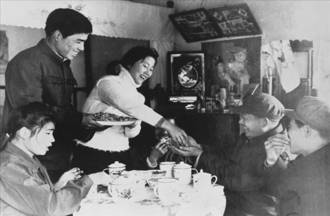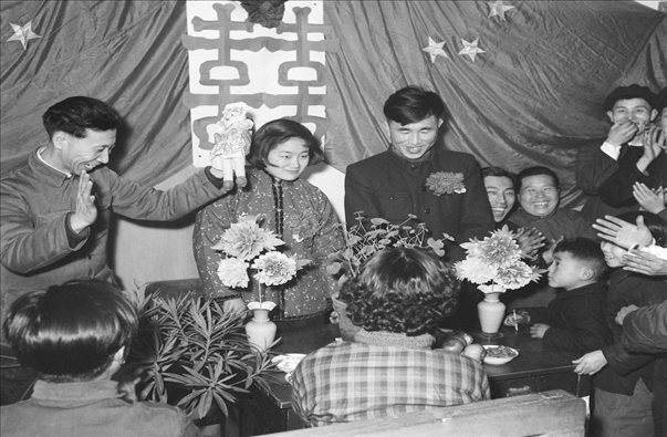 1957年春節(jié),遼寧省沈陽(yáng)風(fēng)動(dòng)工具廠的工人鞠復(fù)海(新郎)和俞鳳仙(新娘)在婚禮儀式上接受朋友們的祝賀。