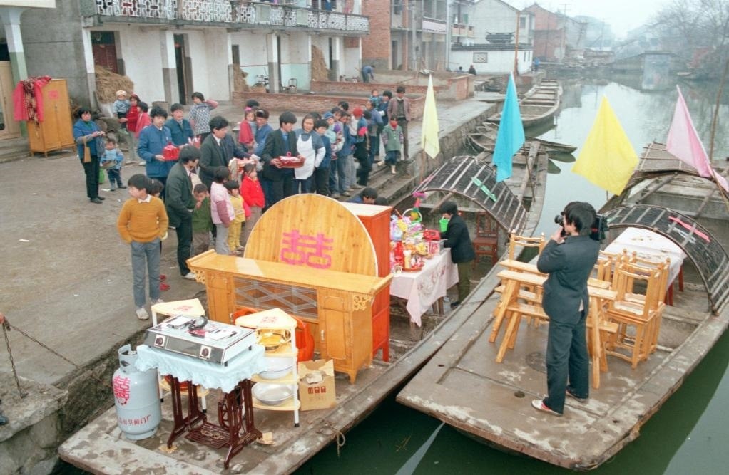 1990年春節(jié)前夕,紹興紅江村的章如花嫁到了一里外的檀瀆村。新郎迎娶新娘所用的交通工具,不是汽車,也不是花轎,而是水鄉(xiāng)里常見(jiàn)的船。富裕起來(lái)的水鄉(xiāng)農(nóng)民在遵循傳統(tǒng)禮儀的同時(shí),也為婚禮增添了現(xiàn)代色彩。比如,陪嫁中少不得電視、煤氣罐;新娘少不得燙發(fā);另一件少不得的,是用攝像機(jī)記錄下婚禮的全部過(guò)程,作為一輩子的紀(jì)念。