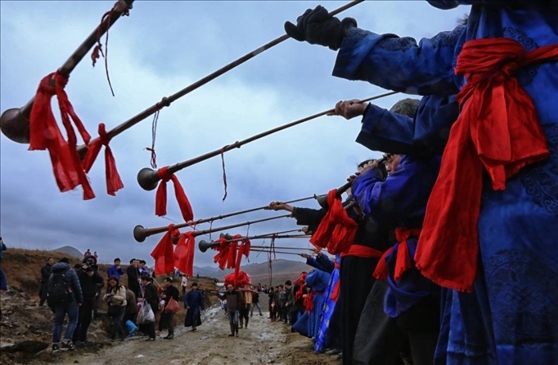 2016年春節(jié)前夕,貴州省惠水縣擺榜鄉(xiāng)石板村村民陳志良按照當(dāng)?shù)鼗樗子怯涝?,新郎接親隊(duì)伍長(zhǎng)鳴長(zhǎng)號(hào)迎娶新娘。