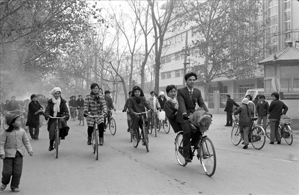 1990年春節(jié)期間,在陜西西安閻良區(qū),胸掛紅花的新郎用自行車馱著新娘經(jīng)過(guò)街頭。那個(gè)年代,用自行車接新娘曾經(jīng)一度成為流行的結(jié)婚方式。