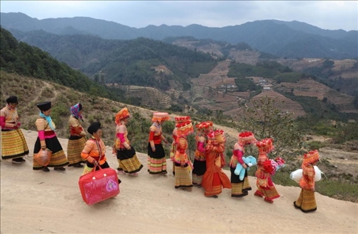 2017年2月21日,在四川省涼山彝族自治州德昌縣南山傈僳族鄉(xiāng)小南山村,新娘張小芳(右四)和送親隊(duì)伍帶著嫁妝向男方家走去。每年春節(jié)前后(農(nóng)歷臘月至次年二月)是當(dāng)?shù)乩圩迦伺e行婚禮的季節(jié)。
