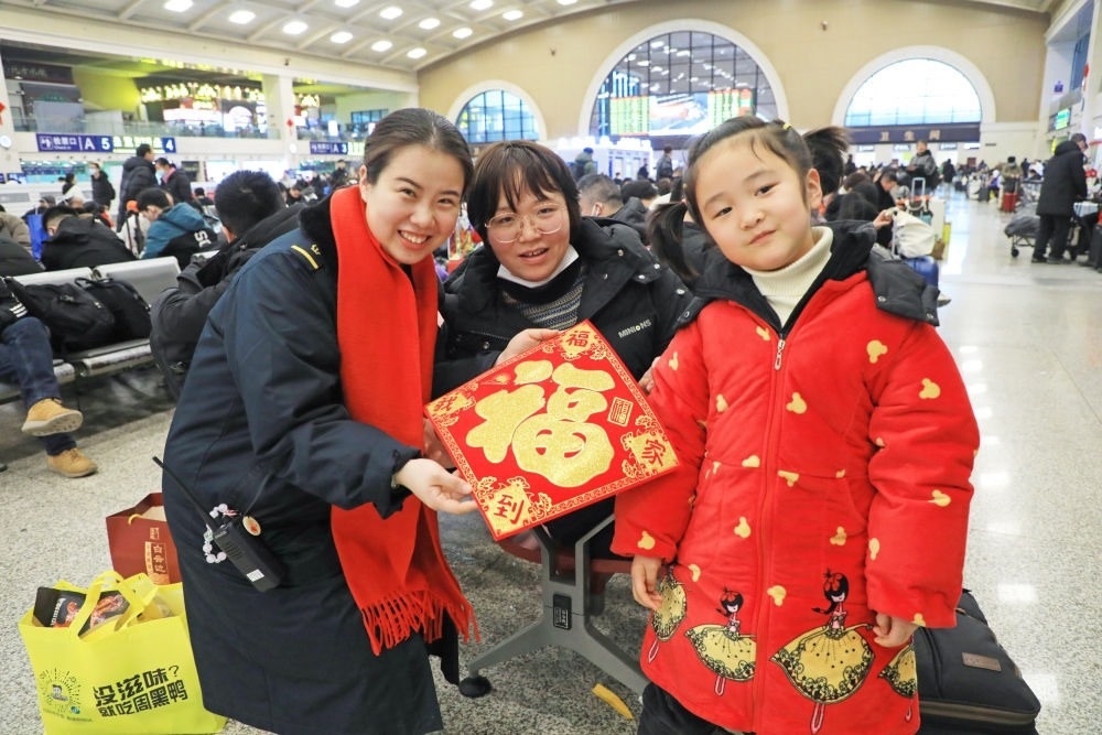 湖北武漢漢口火車(chē)站工作人員為候車(chē)旅客送“福”字(2月2日攝)。新華社發(fā)(邱晟 攝)