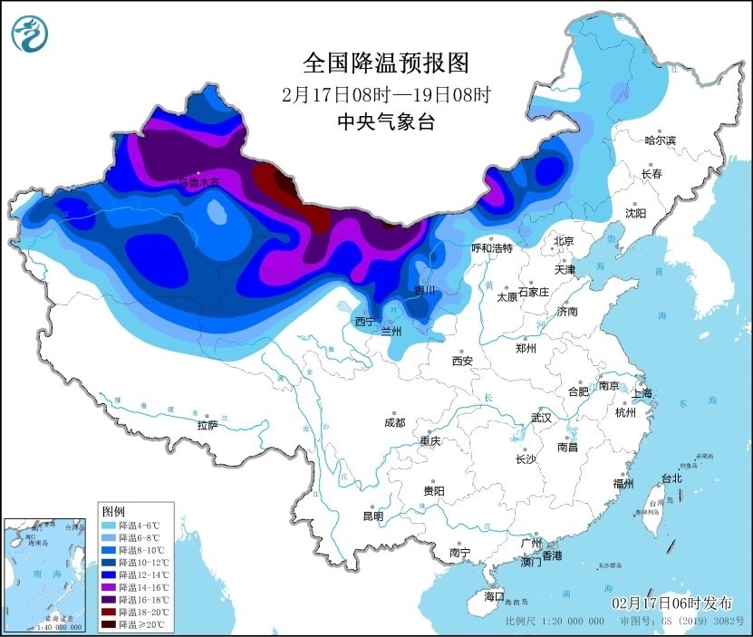 預(yù)計(jì),2月17日08時(shí)至19日08時(shí),新疆大部、內(nèi)蒙古中西部、甘肅大部、寧夏、青海北部等地將先后降溫6~12℃,其中,新疆北部、內(nèi)蒙古西部、甘肅河西等地部分地區(qū)降溫可達(dá)12~20℃,局地20℃以上。
