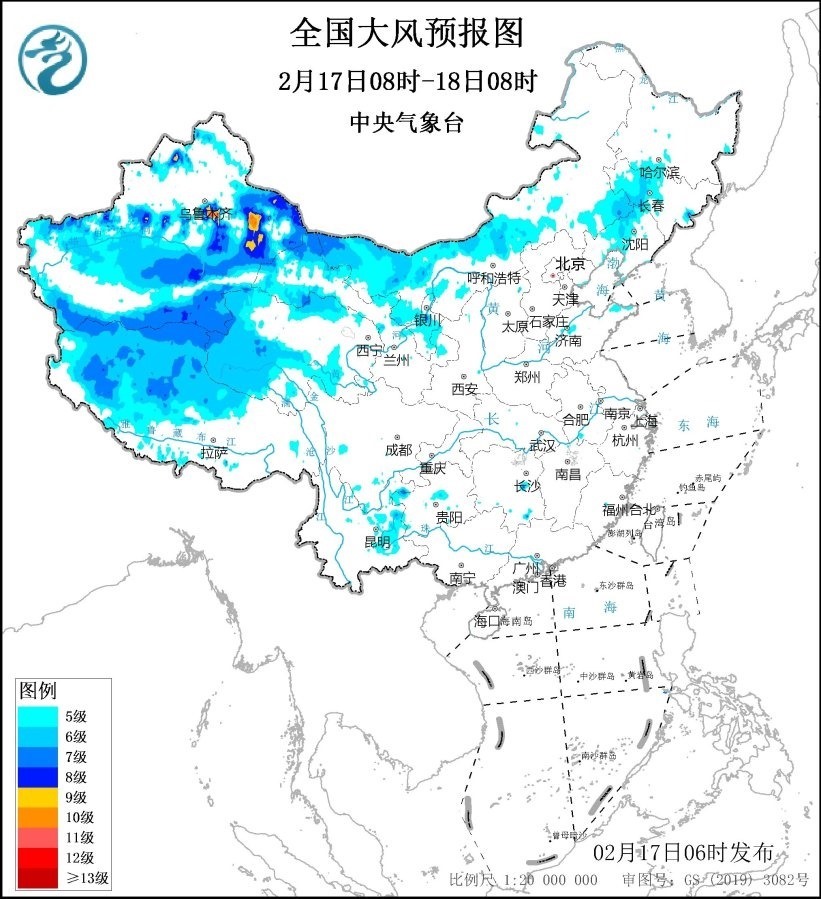 2月18日08時(shí)至19日08時(shí),新疆南疆盆地、內(nèi)蒙古西部、青海西南部、西藏西部、甘肅西部等地將有5~6級(jí)、陣風(fēng)7~9級(jí)的大風(fēng);渤海、渤海海峽、黃海大部海域、東海北部海域?qū)⒂?~8級(jí)、陣風(fēng)9級(jí)的大風(fēng)。