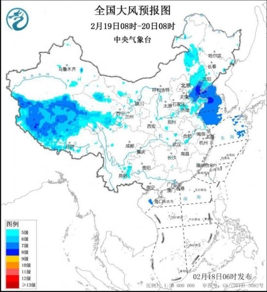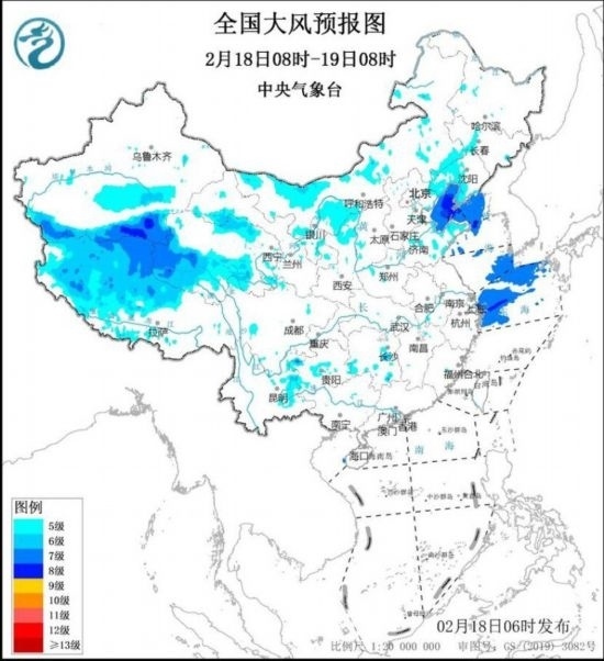 2月18日8時至19日8時,新疆南疆盆地東部、西藏中西部、青海南部、甘肅河西、內(nèi)蒙古中西部、遼寧中西部等地將有5~6級、陣風(fēng)7~8級的大風(fēng);渤海、渤海海峽、黃海北部海域、東海北部海域?qū)⒂?~8級、陣風(fēng)9~10級的大風(fēng)。2月19日8時至20日8時,西藏中西部、青海南部、甘肅河西、內(nèi)蒙古中東部、遼寧西部和南部等地將有5~6級、陣風(fēng)7~8級的大風(fēng);渤海、渤海海峽、黃海大部海域?qū)⒂?~8級、陣風(fēng)9~10級的大風(fēng)。中央氣象臺2月18日6時繼續(xù)發(fā)布大風(fēng)藍(lán)色預(yù)警。