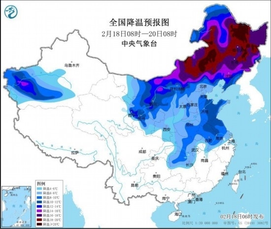 全國降溫預(yù)報圖(2月18日8時-20日8時)
