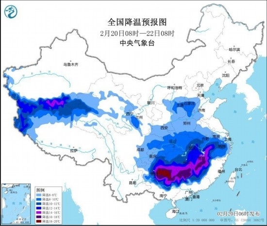 預計,2月20日8時至2月22日8時,華北南部、黃淮西部、江淮西部、江漢、江南中北部、貴州東部、廣西北部等地的部分地區(qū)將先后降溫8~10℃,其中,江漢、江南中西部、貴州東部等地將降溫12℃~14℃,湖南南部、江西南部、貴州東部、廣西北部等地的部分地區(qū)降溫可達16℃以上。