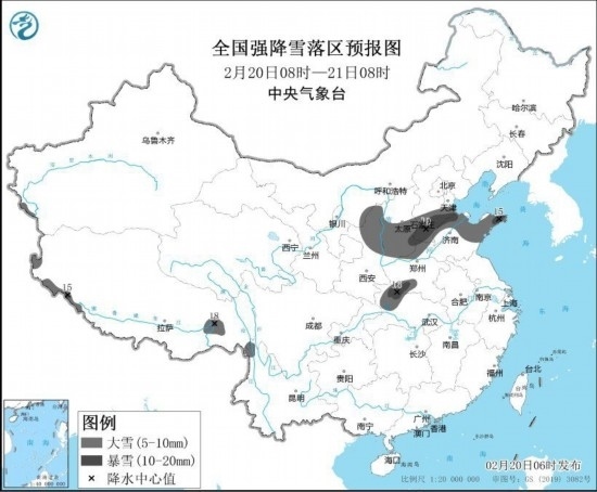 預計2月20日08時至2月21日08時,陜西北部、山西中南部、河北中南部、山東中東部和北部、河南北部和西南部、湖北西北部、西藏西部和東南部等地的部分地區(qū)有大雪,其中,山西東南部、河北南部、山東西北部和東部、河南西南部、湖北西北部等地的部分地區(qū)有暴雪(10~19毫米)。上述部分地區(qū)新增積雪深度3~7厘米,局地可達10厘米以上。