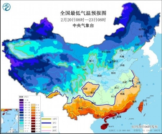 中新網(wǎng)2月20日電 據(jù)中央氣象臺網(wǎng)站消息,中央氣象臺2月20日6時繼續(xù)發(fā)布寒潮橙色預警:受寒潮影響,預計,2月20日至2月23日,我國中東部大部將自北向南先后出現(xiàn)降溫,日平均或最低氣溫普遍下降8~12℃,華北南部、黃淮西部、江淮、江漢、江南、華南中北部及貴州等地氣溫將下降12~18℃,其中,湖南南部、貴州東部、廣西北部等地的部分地區(qū)累計降溫幅度可達20℃以上。2月23日前后,最低溫度0℃線將南壓到蘇皖南部至湖南南部、貴州南部一帶。