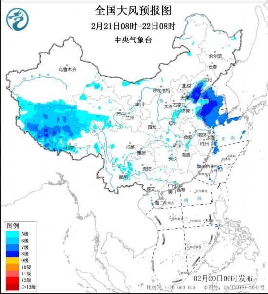2月21日8時至22日8時,西藏中西部、青海中南部、華北東部、黃淮西部和東部、江淮西部等地的部分地區(qū)有5~6級風,陣風7~8級。渤海、渤海海峽、黃海大部海域?qū)⒂?~8級,陣風9~10級的大風。