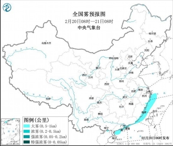 中央氣象臺2月20日6時繼續(xù)發(fā)布大霧黃色預警: