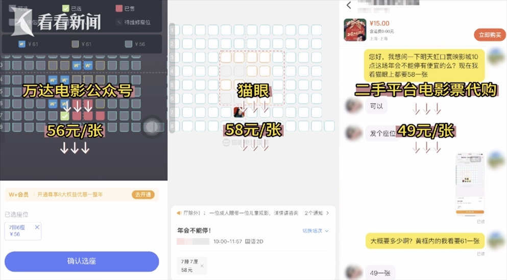 為了求證這一說法,記者來到了網(wǎng)友爆料的這家電影院,并提前通過三種渠道在線上購入了同天、同電影院、同場(chǎng)次、同排位置的三張電影票,分別花費(fèi)了56元、58元、49元。