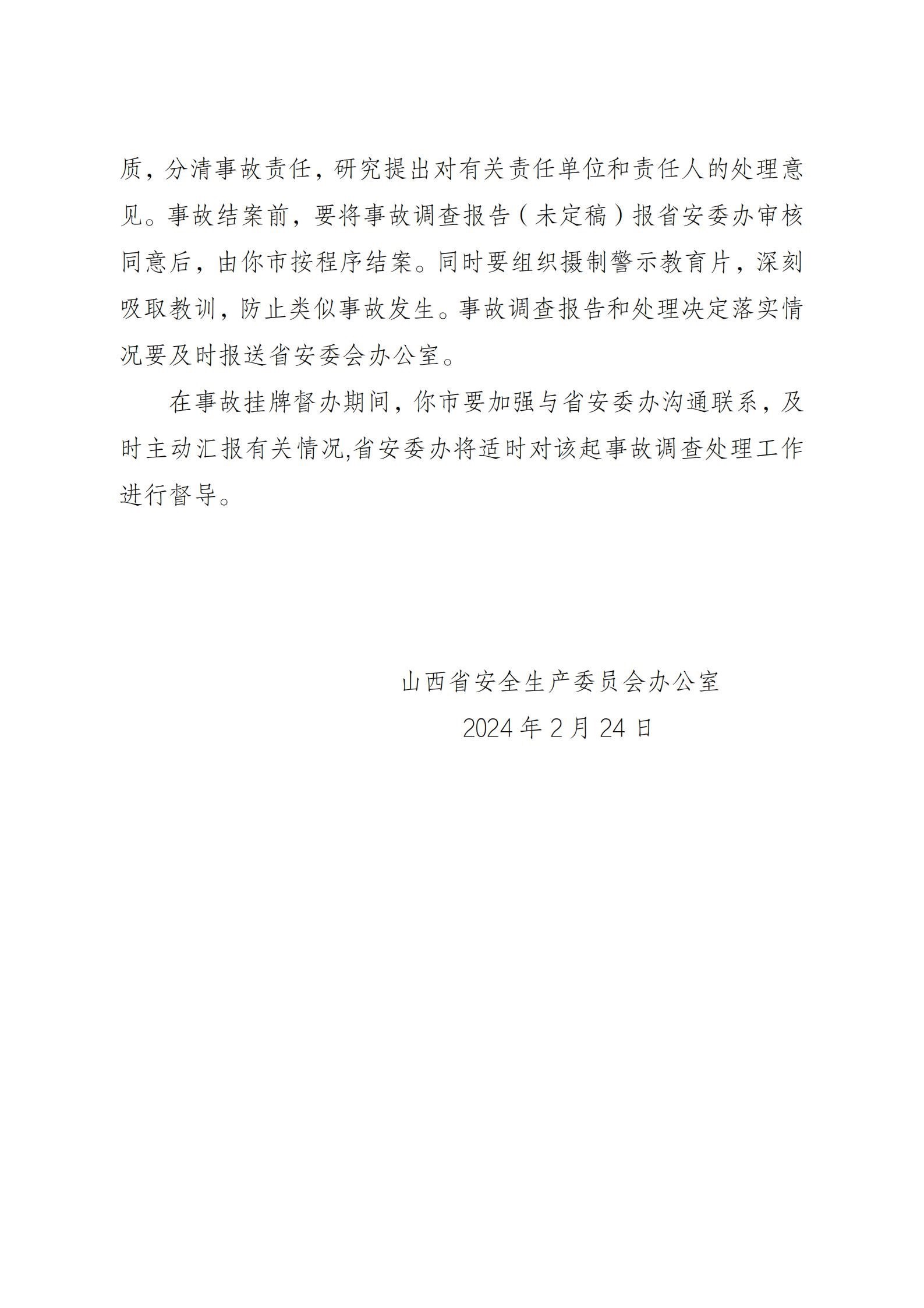 根據(jù)《國務(wù)院關(guān)于進(jìn)一步加強企業(yè)安全生產(chǎn)工作的通知》《山西省較大事故查處掛牌督辦辦法》等有關(guān)規(guī)定要求,山西省安委辦決定對該起事故查處實行掛牌督辦。要求呂梁市依據(jù)有關(guān)法律法規(guī)和規(guī)定,組織進(jìn)行事故調(diào)查,查明事故原因,認(rèn)定事故性質(zhì),分清事故責(zé)任,研究提出對有關(guān)責(zé)任單位和責(zé)任人的處理意見。事故結(jié)案前,要將事故調(diào)查報告報山西省安委辦審核同意后,由呂梁市按程序結(jié)案。同時要組織攝制警示教育片,深刻吸取教訓(xùn),防止類似事故發(fā)生。事故調(diào)查報告和處理決定落實情況要及時報送山西省安委辦。